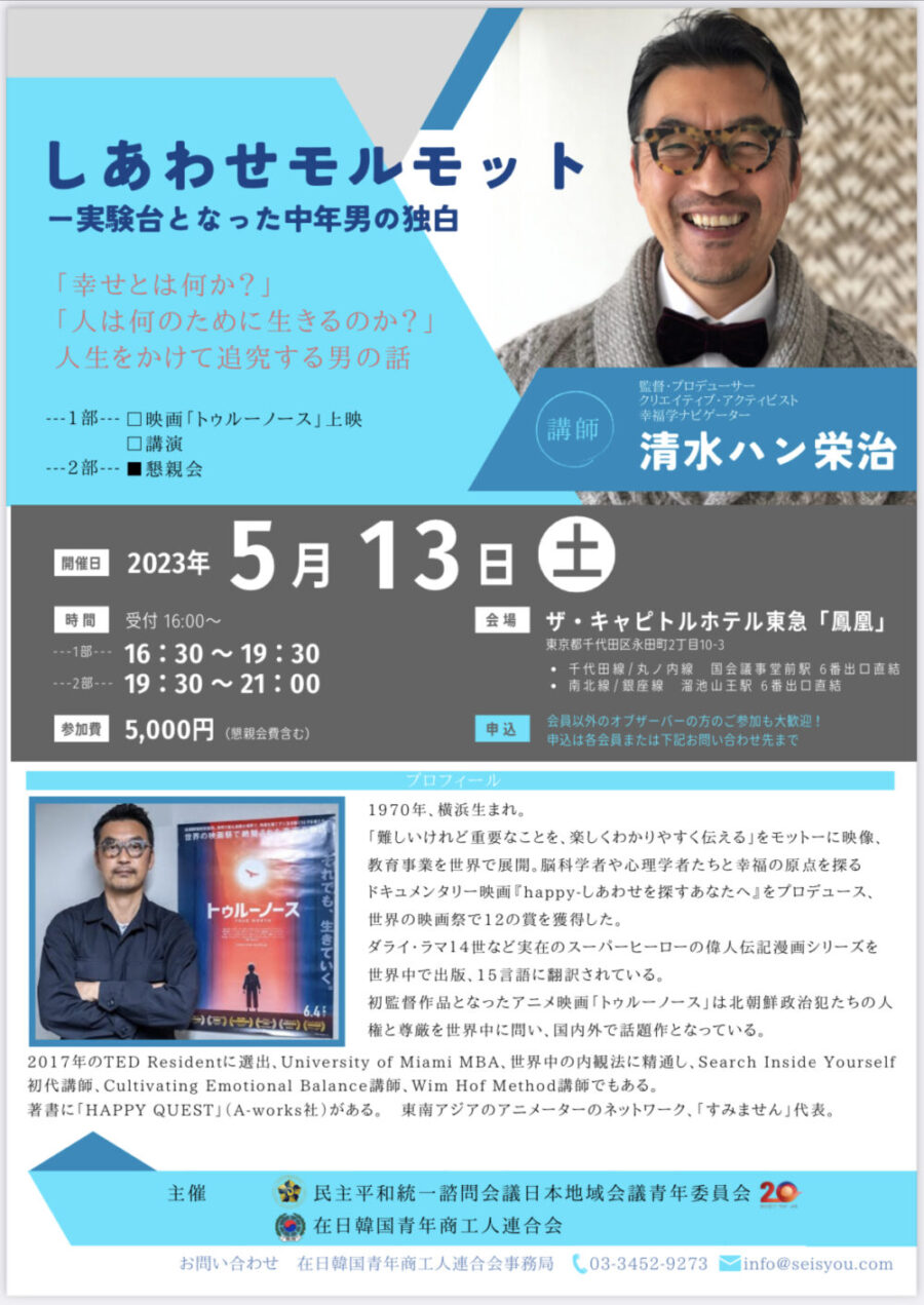 下記の通り、 当 在日韓国青年商工人連合会と民主平和統一諮問会議の共催による講演会を開催致します。 お申込みは、下記フォームよりご対応下さい。 https://docs.google.com/forms/d/e/1FAIpQLScqvtGNw